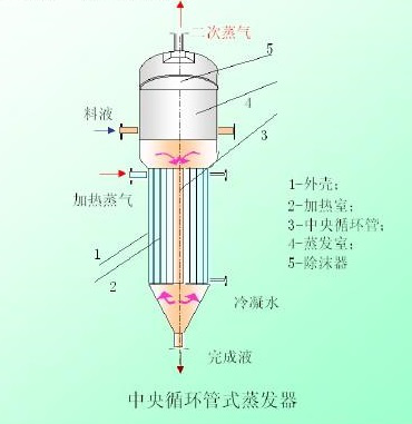 中央循環蒸發室是加熱室上部的圓筒體。料液經過加熱管加熱,水分汽化,料液比重變小,而中央降液管中料液沒被加熱至沸騰(料液比重較大)。由于傳熱產生重度差,形成物料在加熱管和降液管中的循環,將水分蒸發,達到濃縮的目的。而加熱蒸汽釋放出潛熱后,變成水,從底部排出管排出。