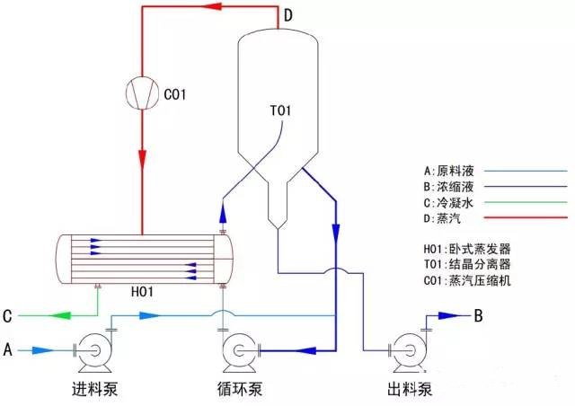 晶漿從循環管路中用出料泵輸出。蒸發分離器內的二次蒸汽經過蒸發分離器上部的分離和除沫裝置凈化后輸送到壓縮機,壓縮機把二次蒸汽壓縮后輸送到換熱器殼程用作蒸發器加熱蒸汽,實現熱能循環連續蒸發。